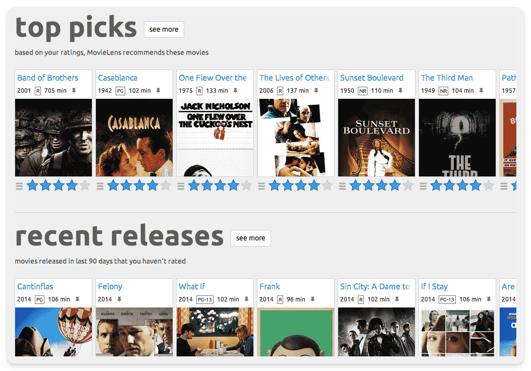 We’ll be using a subsample of the MovieLens dataset (available at this page). This dataset contains 20 million ratings applied to 62,000 films from 162,000 users. Fortunately, the random sample we’re using is slightly smaller: 100,000 ratings for 9,000 films.